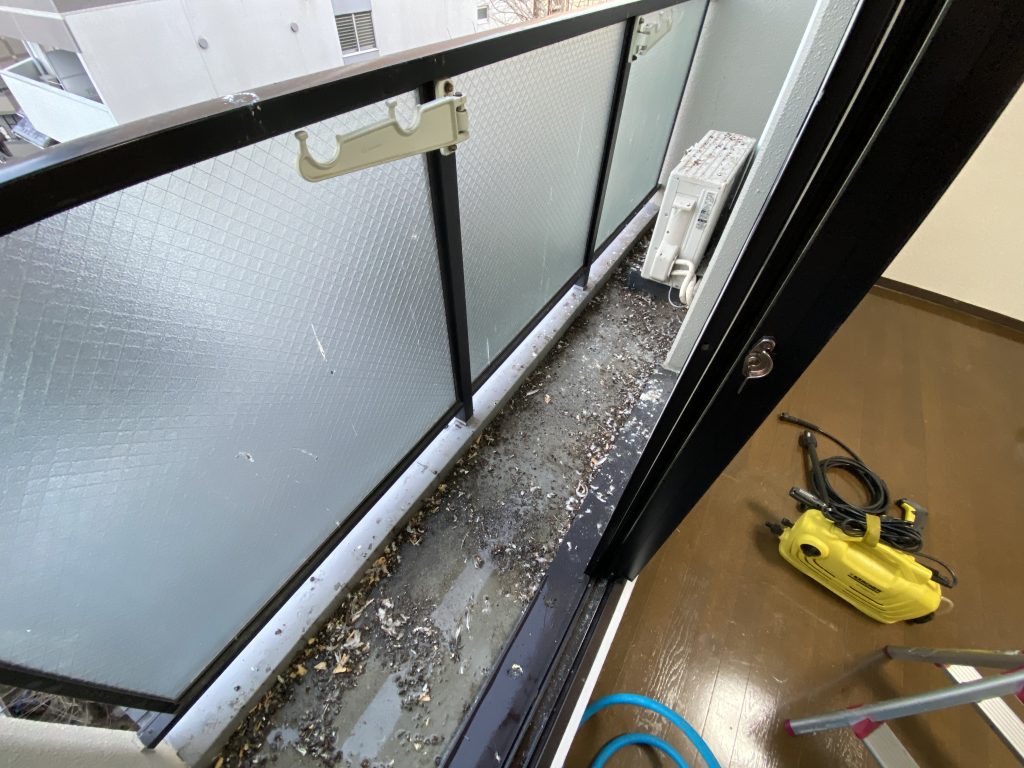 今回のご依頼は、京都市上京区の分譲マンション賃貸物件の空室ハウスクリーニングです。室内は比較的綺麗な状態でしたが、ベランダの鳩のフンが大量に積もっており、清掃が必要な状況でした。