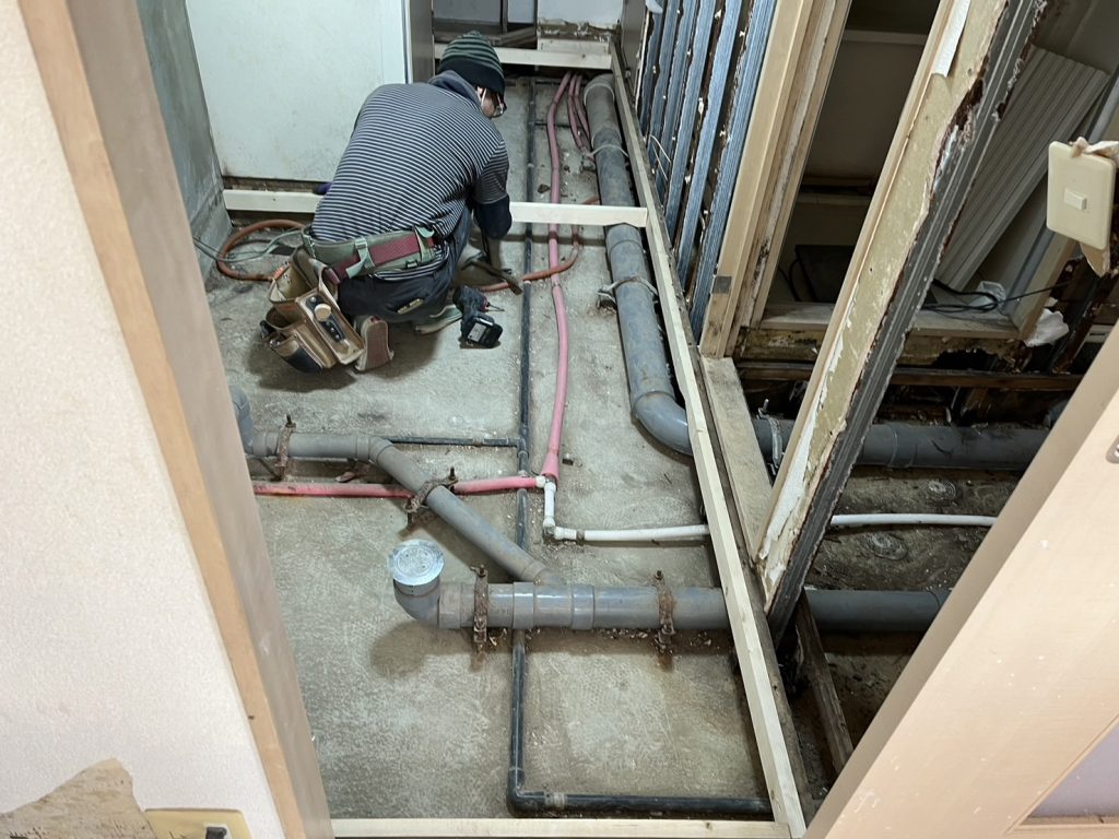 給水・給湯・排水管の仕込みのあと、束にて床レベルを出し、パーチクルボードにて床下地を作っております。洋間はフローリング施工、キッチン周りなどはフロアタイル仕上りを考えておりますので、キッチン周りは5.5㎜のベニヤ板をマシ貼りする予定です。