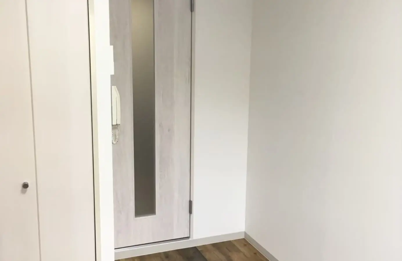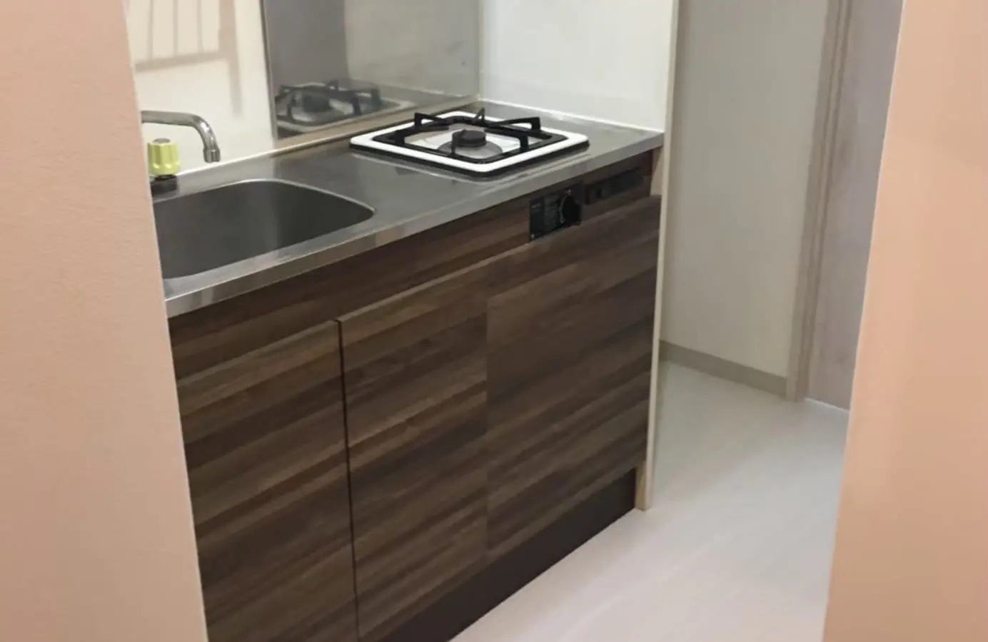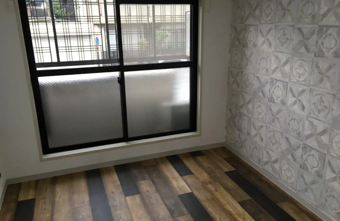工事内容としては、クロスと床材の貼替・ダイノックシートによるキッチンリメイク・家具類の設置・室内物干し金具の取付・建具の交換・冷蔵庫置き場の設置になります。
